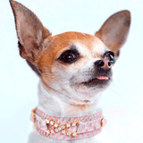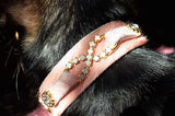 This is a beautiful sophisticated collar for everyday use with crystals and beautiful leathers. Its low weight makes it perfect for very small dogs and cats too. Snake patterned shimmery light violet leather matching with opal crystals or fuchsia pink leathers with white crystal variation are available. See photos!