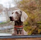 Beautiful and savage dog collar Kwatile for sizes from S to XL dogs. Soft large patterned croco leather in wide sizes or normal standard width. This is a very durable collar. In the center we have added a strong metal brooch with tiny cool metal decorations. Kwatile is a sturdy dog collar with a savage cool feeling and soft durable leathers. This collar ages with beauty.
