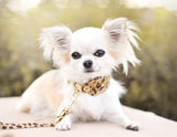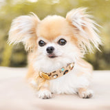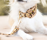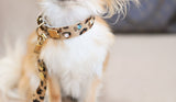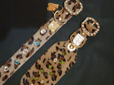 This beautiful leopard printed dog collar is very soft and comfortable. Perfect for really small dogs, and it is decorated with beautiful Swarovski crystals. This collar comes in two width and you can also choose between turquoise stones or green stones.
