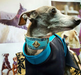 The very small grey Italian Greyhound with turqouise collar is wearing the XXS Sighthound size.