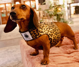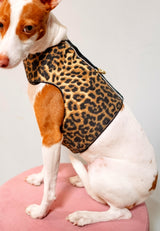 The Podenco (6 kilo, 13,2 ibs), is wearing the S size in leopard.