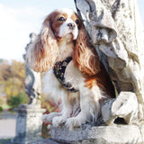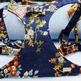 Beautiful adjustable harness for very small to medium small dogs in navy blue with flowers.