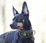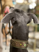 Our olive leather is combined with our hand painted copper leather. It is a great match and also makes for a strong lovely collar for every day.
