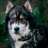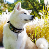 Sioux One Feather dog collar is a unique dog collar with beautiful Native American details. 100% patterned strong leathers with dark brass metals.