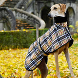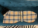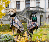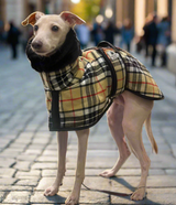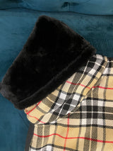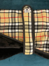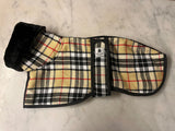 Elegant urban kamelrutig vindjacka för vinthundar. Extra varm. Högkvalitativt mjukt svart fuskpäls på insidan.