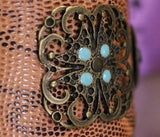 Our beautiful wider Flower Power dog collar for breeds from M to XXL double size is resistant and cool. The metal part is very resistant and slightly curved to follow the dogs neck. A very comfortable dog collar that ages with beauty. Many color options.