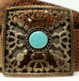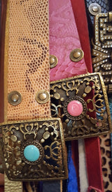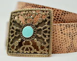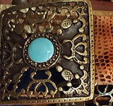 Our impressive Empire belt in beige brown snake pattern. You can also match it with the Empire Snake Dog Collar for large dogs! Enamel in turquoise. This is a very resistant and strong belt. This leather has a lot of variations in tone and color but all equally beautiful. In beige and brown.
