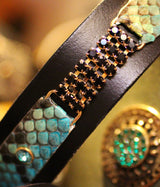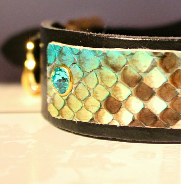 Very exclusive cat collar with gorgeous crystals and hand painted python. The python change tones depending on the cut.