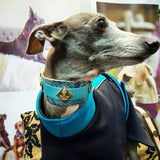 The very small grey Italian Greyhound with turqouise collar is wearing the XXS Sighthound size.