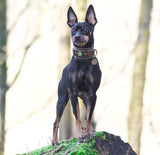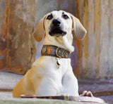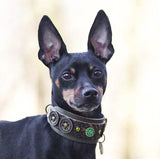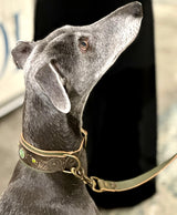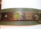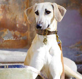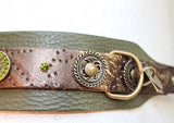 Our olive leather is combined with our hand painted copper leather. It is a great match and also makes for a strong lovely collar for every day.