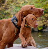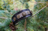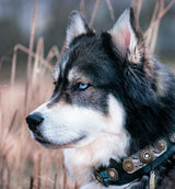 A unique dog collar with native american details on very strong leathers that ages with beauty. Details in brass!