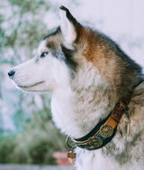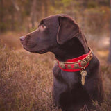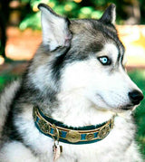 Precious haute couture collar for large or strong breeds with our best luxury leathers in several layers in beautiful contrasting colours. A strong dog collar with many beautiful details lasting a lifetime. In red, blue or brown with bronze or classy black base. This collar is also perfect for giant dog breeds.