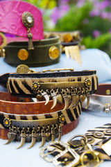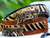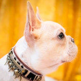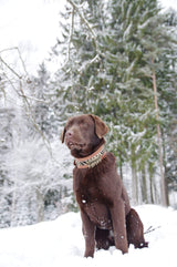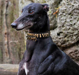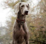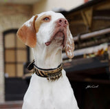 Beautiful and savage dog collar Kwatile for sizes from S to XL dogs. Soft large patterned croco leather in wide sizes or normal standard width. This is a very durable collar. In the center we have added a strong metal brooch with tiny cool metal decorations. Kwatile is a sturdy dog collar with a savage cool feeling and soft durable leathers. This collar ages with beauty.