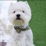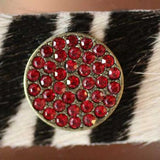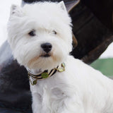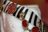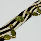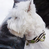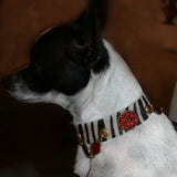 Zebra Safari collar is a very beautiful extra soft pet collar with zebra patterned cow leather and ruby or olive green colored Swarovski crystals and enamelled hangings on the sides.