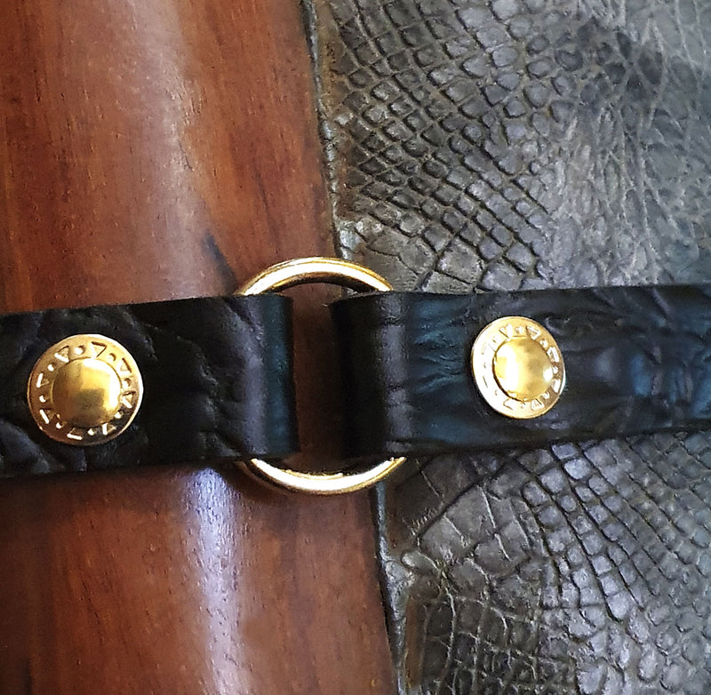We have used a black strong leather with a soft pattern teamed with golden metal elements.